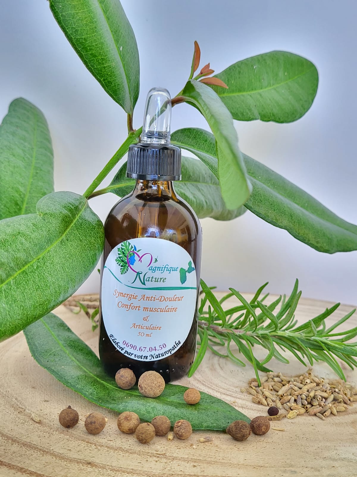 Mélanges d’huiles essentielles, efficace sur tous types de douleurs, idéal pour les sportifs.